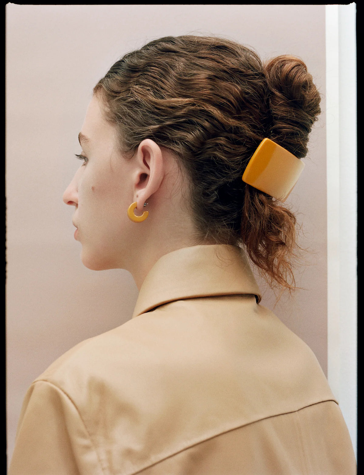 The barrette clip is a different type of hair accessory, fastened with a metal base clip that holds the hair in place between a metal arm and a tension bar. MACHETE’s barrette clips are finished with a fine acetate topper, which is more durable and eco-friendly than the plastic or resin found on most barrette clips.