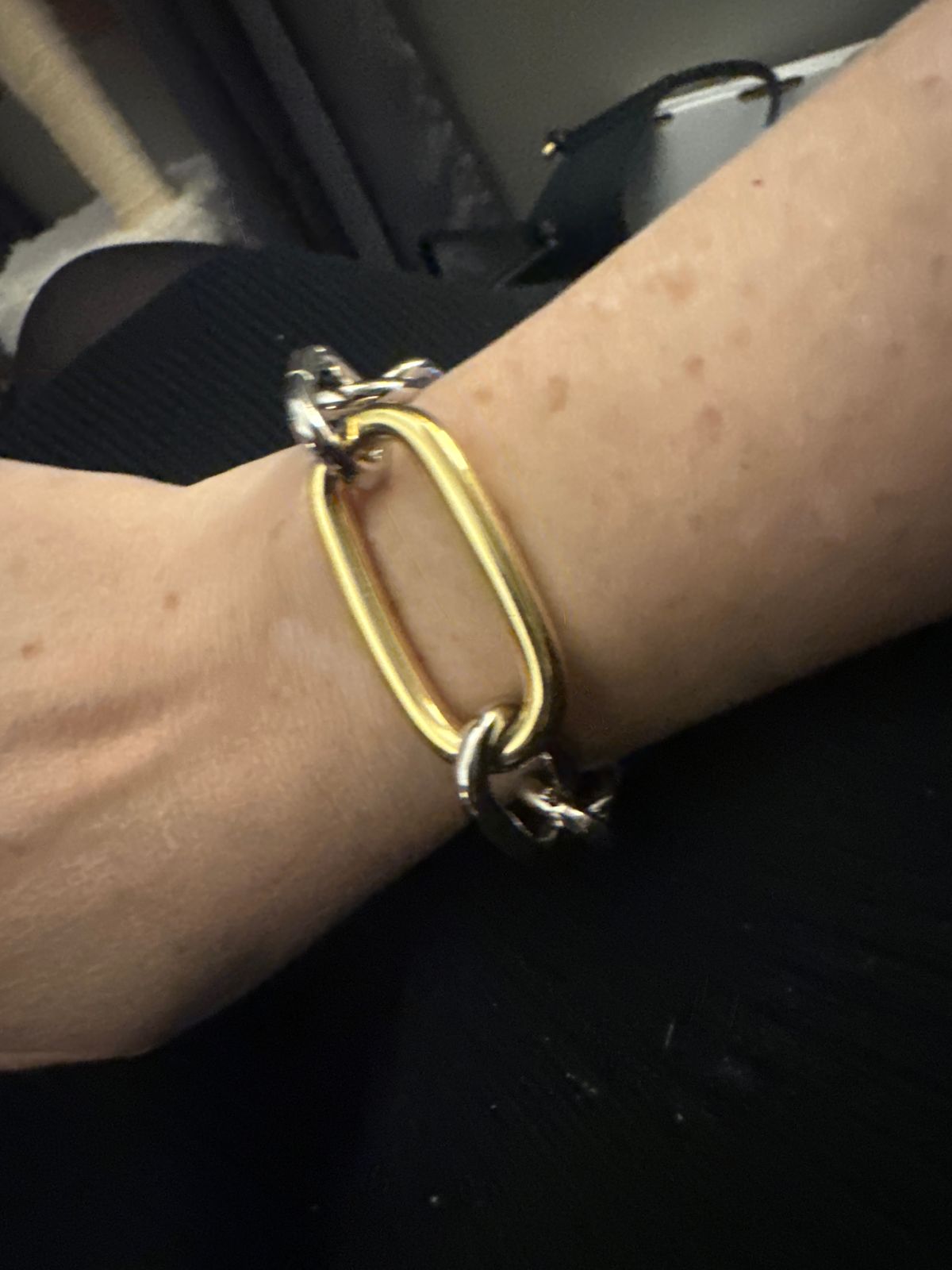 Chunky, mixed metals link bracelet with seamless closure. Handmade from 14K gold and rhodium-plated recycled brass, available in two sizes.