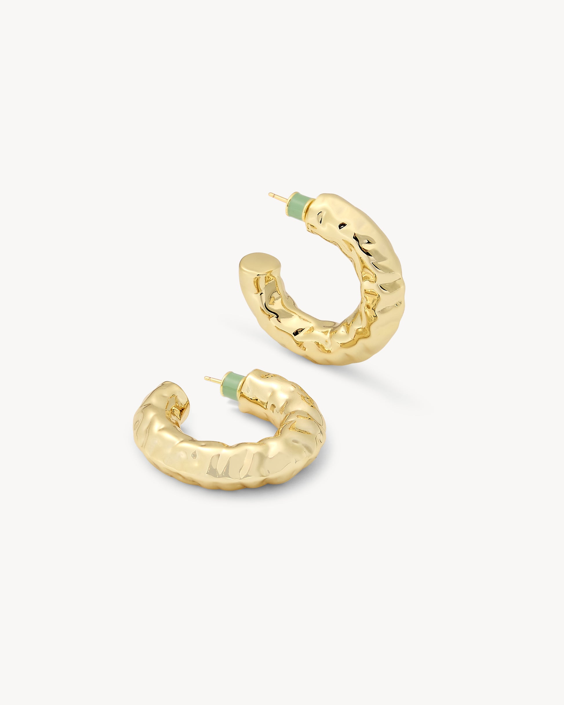 A classic hoop shape with a striking crunch texture, handmade from recycled brass and plated in 14K gold. Hypoallergenic posts with signature Machete green backings.