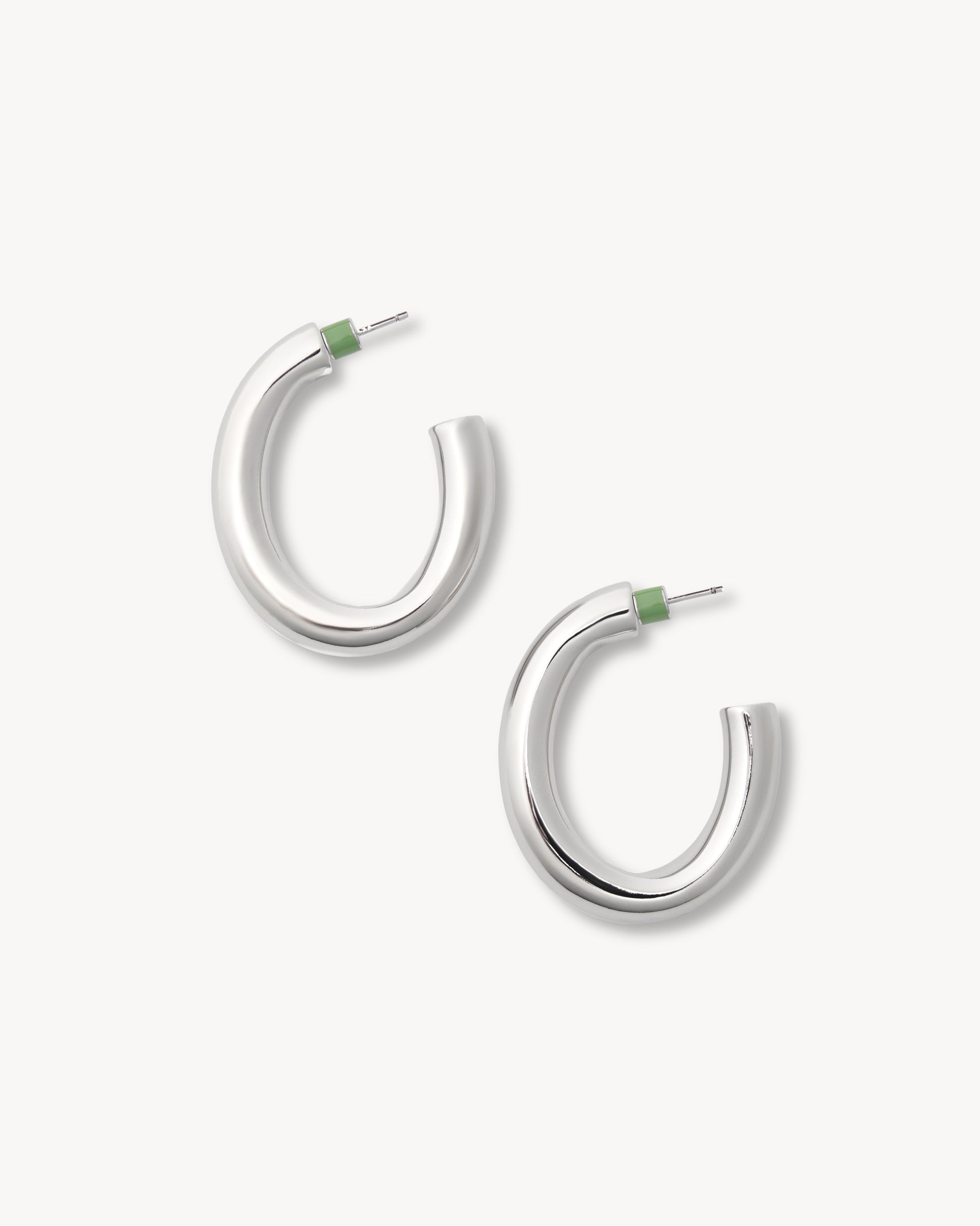 Oversized oval hoops with unassuming allure, handmade from recycled brass and plated in Rhodium. Hypoallergenic posts with signature Machete green backings.