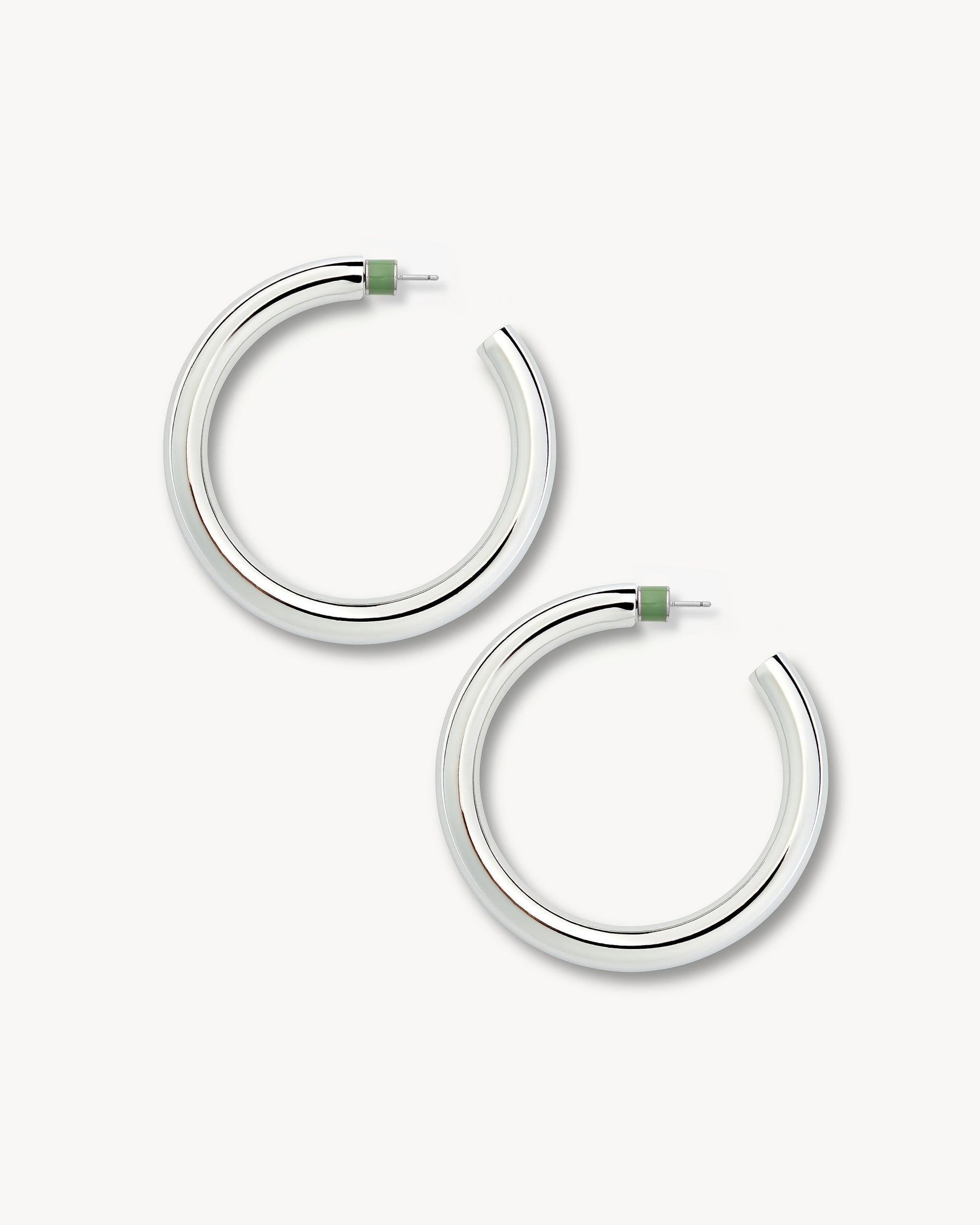 Oversized hoops, handmade from rhodium plated recycled brass. Hypoallergenic posts with green barrel backings.