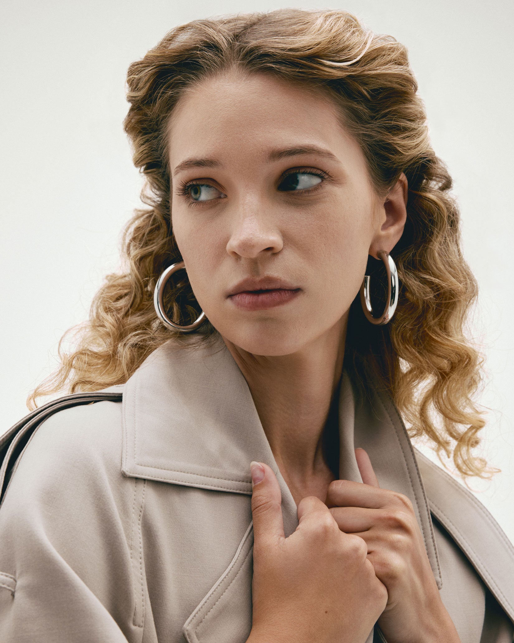 Oversized oval hoops with unassuming allure, handmade from recycled brass and plated in Rhodium. Hypoallergenic posts with signature Machete green backings.