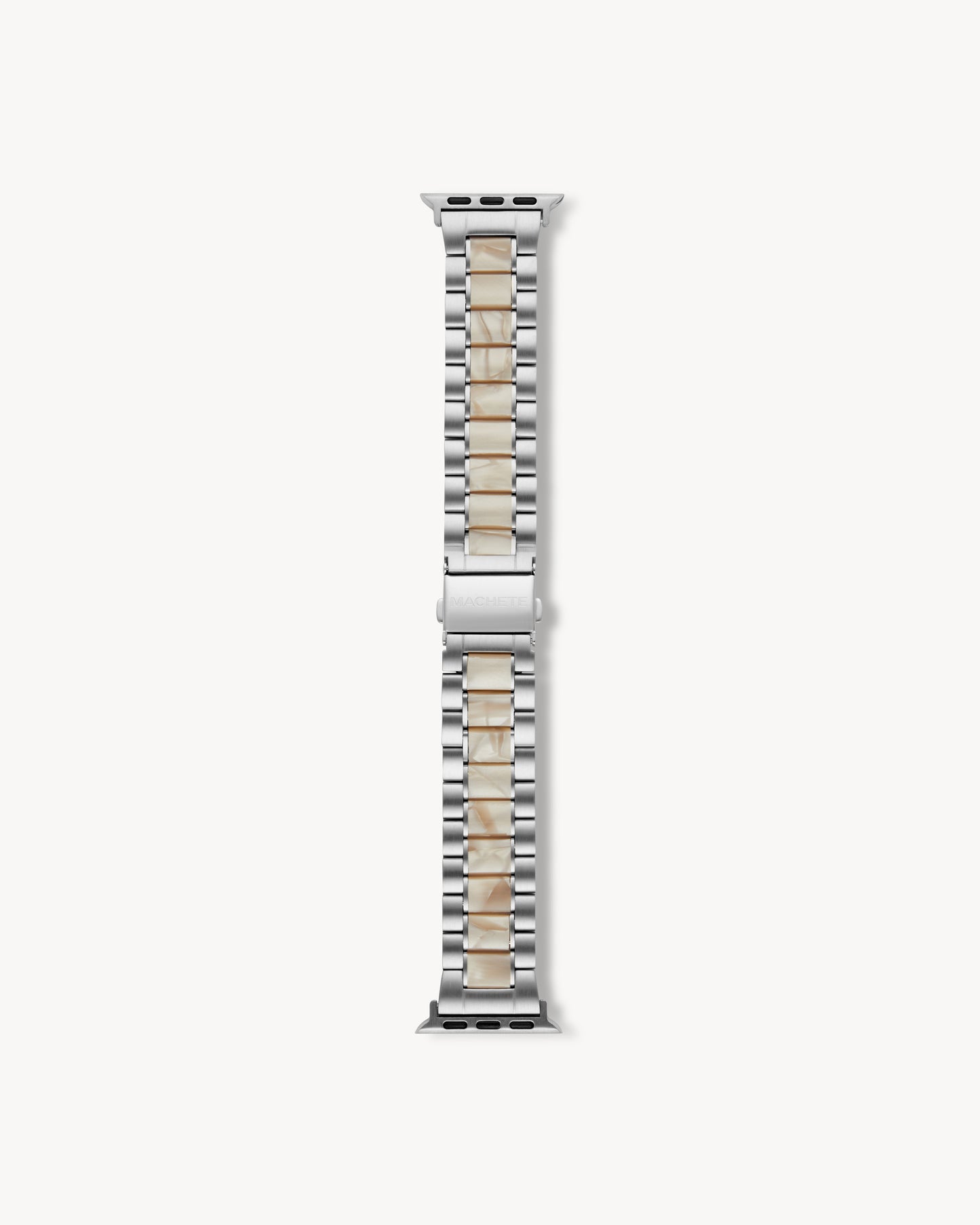 Masculine style with a MACHETE twist. The Boyfriend Apple Watch Band features a one-of-a-kind band made from stainless steel and fine Italian acetate. Includes an adaptable connector to fit any Apple watch face size.