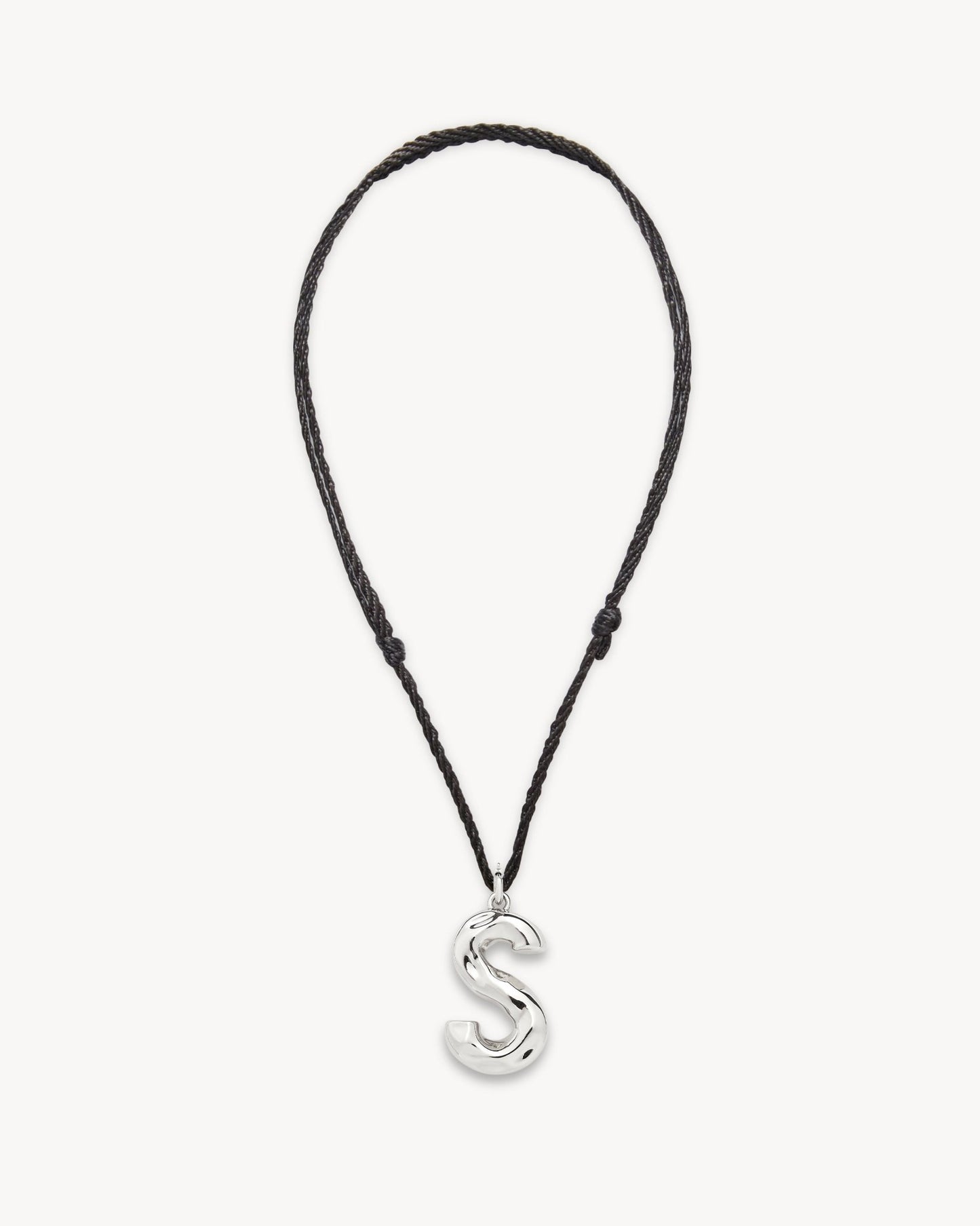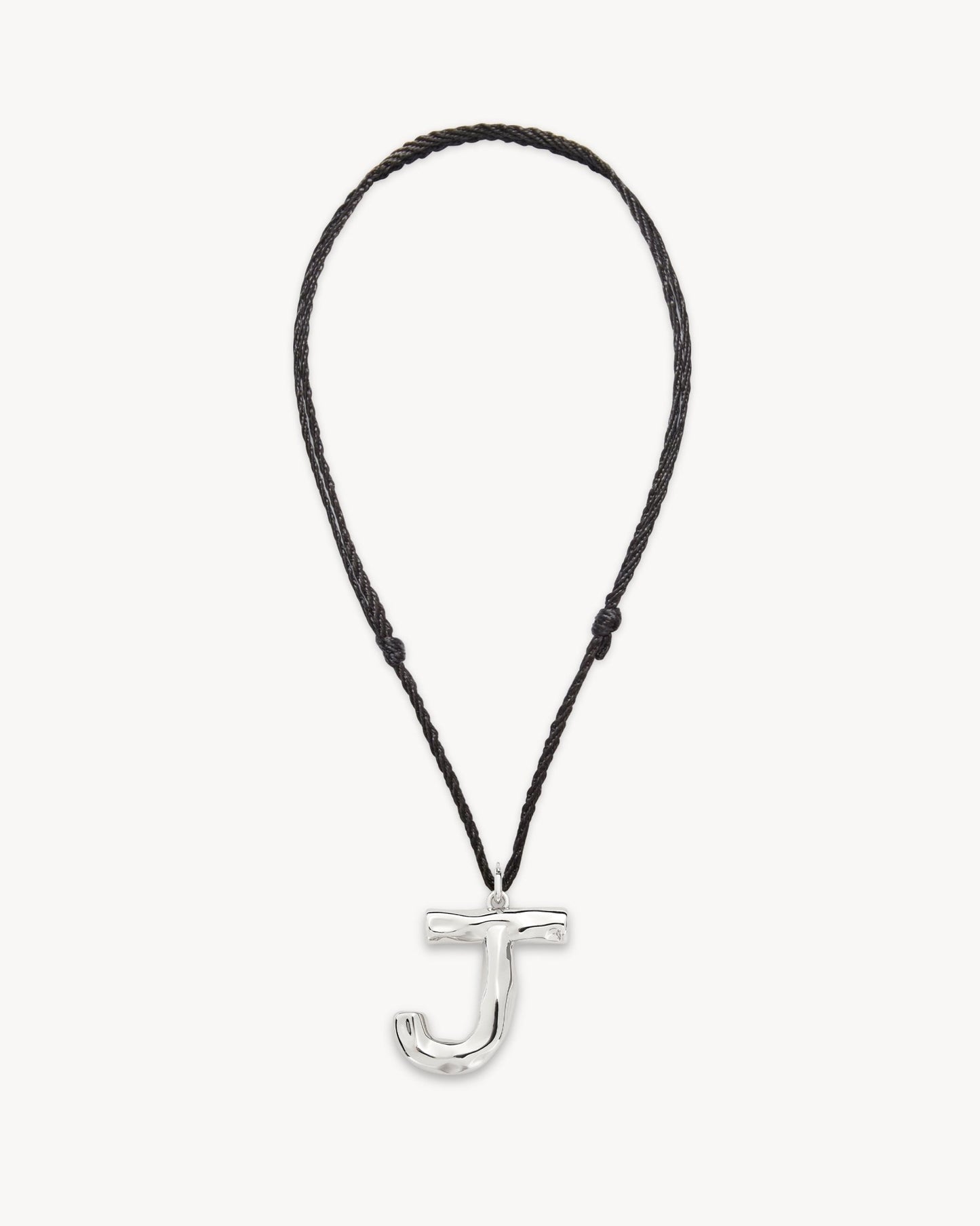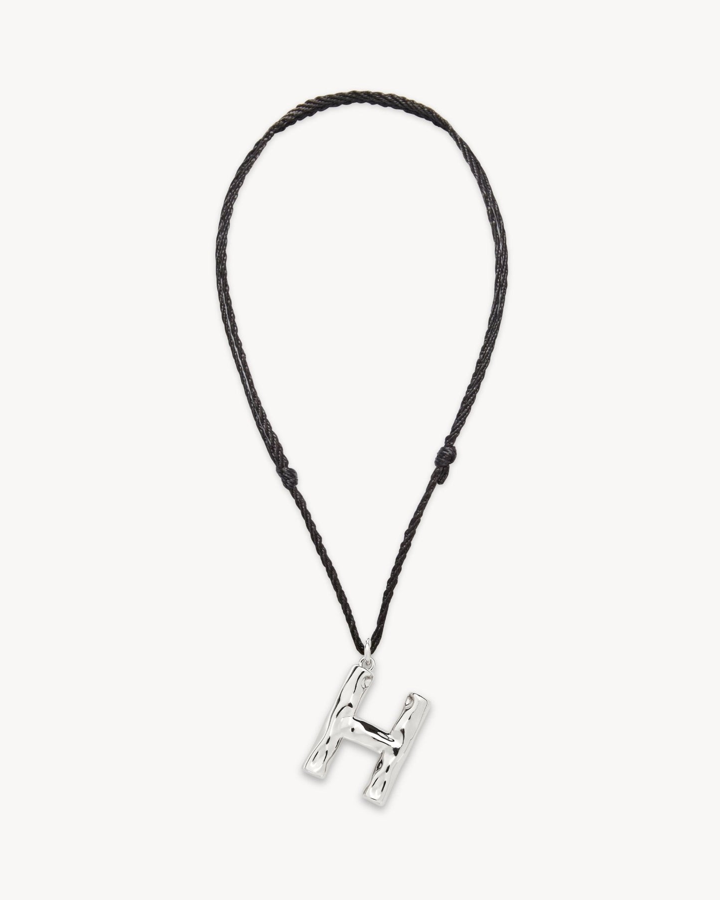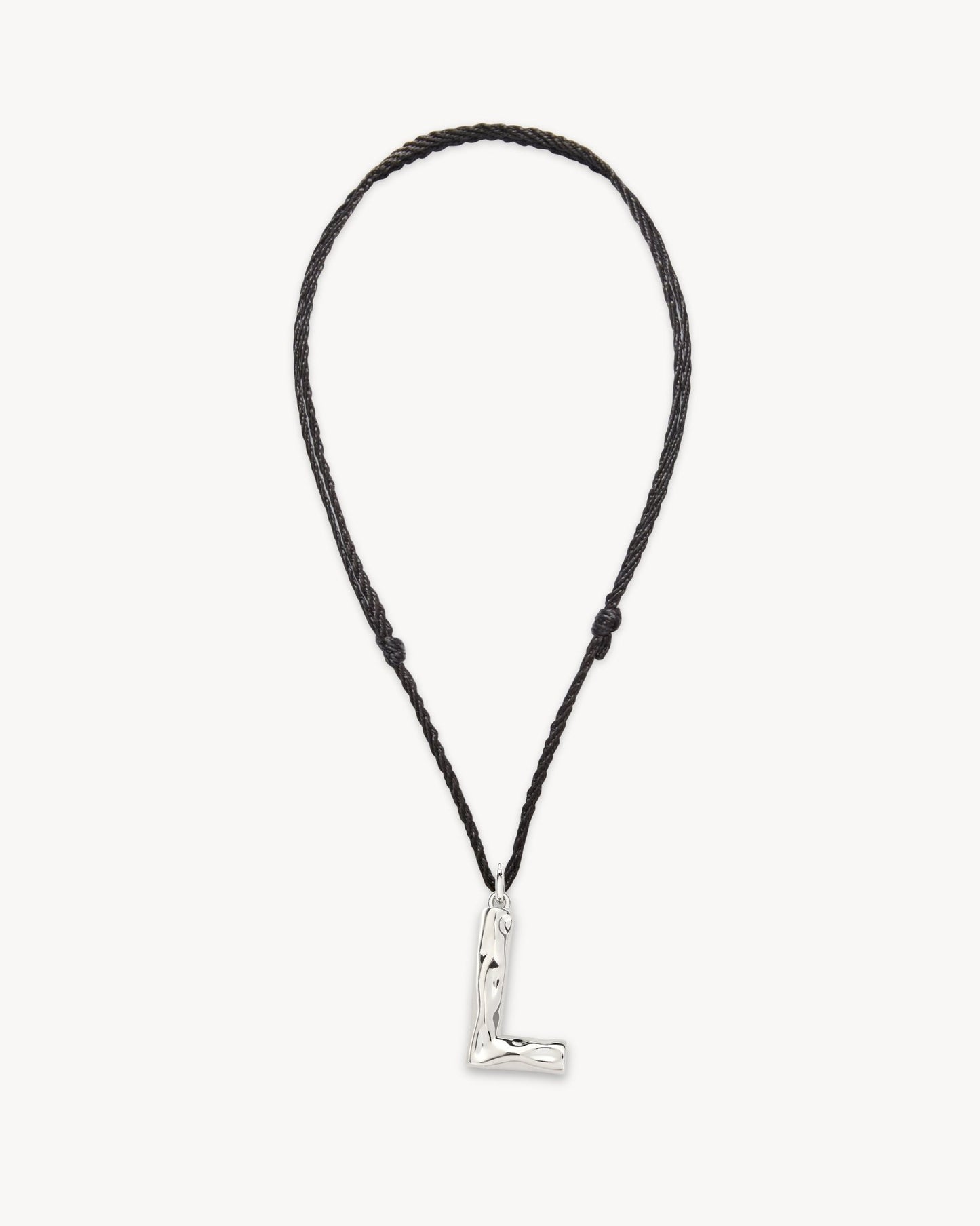 Statement letter charm necklace, handmade from hammered brass with rhodium plating on an adjustable silk cord.