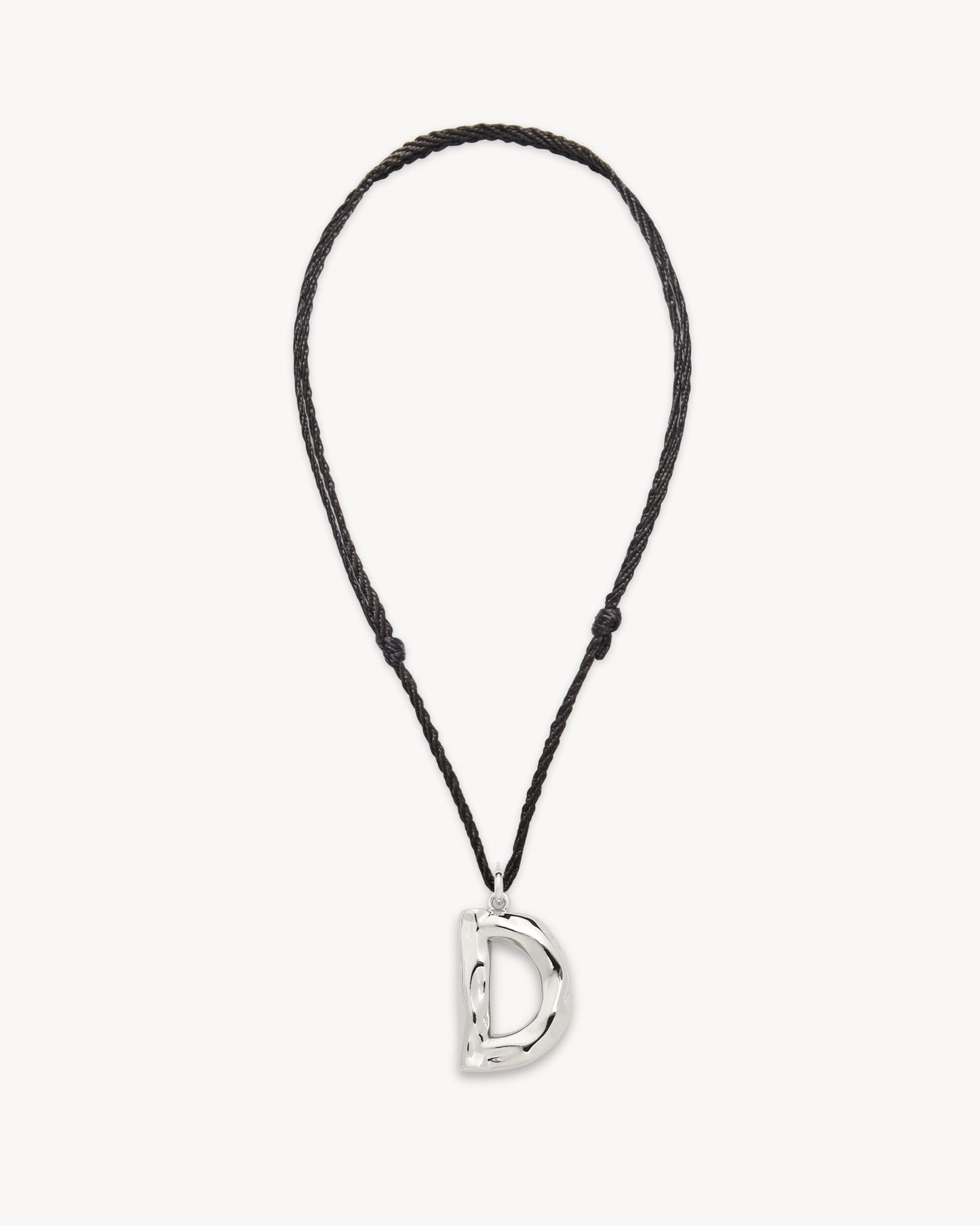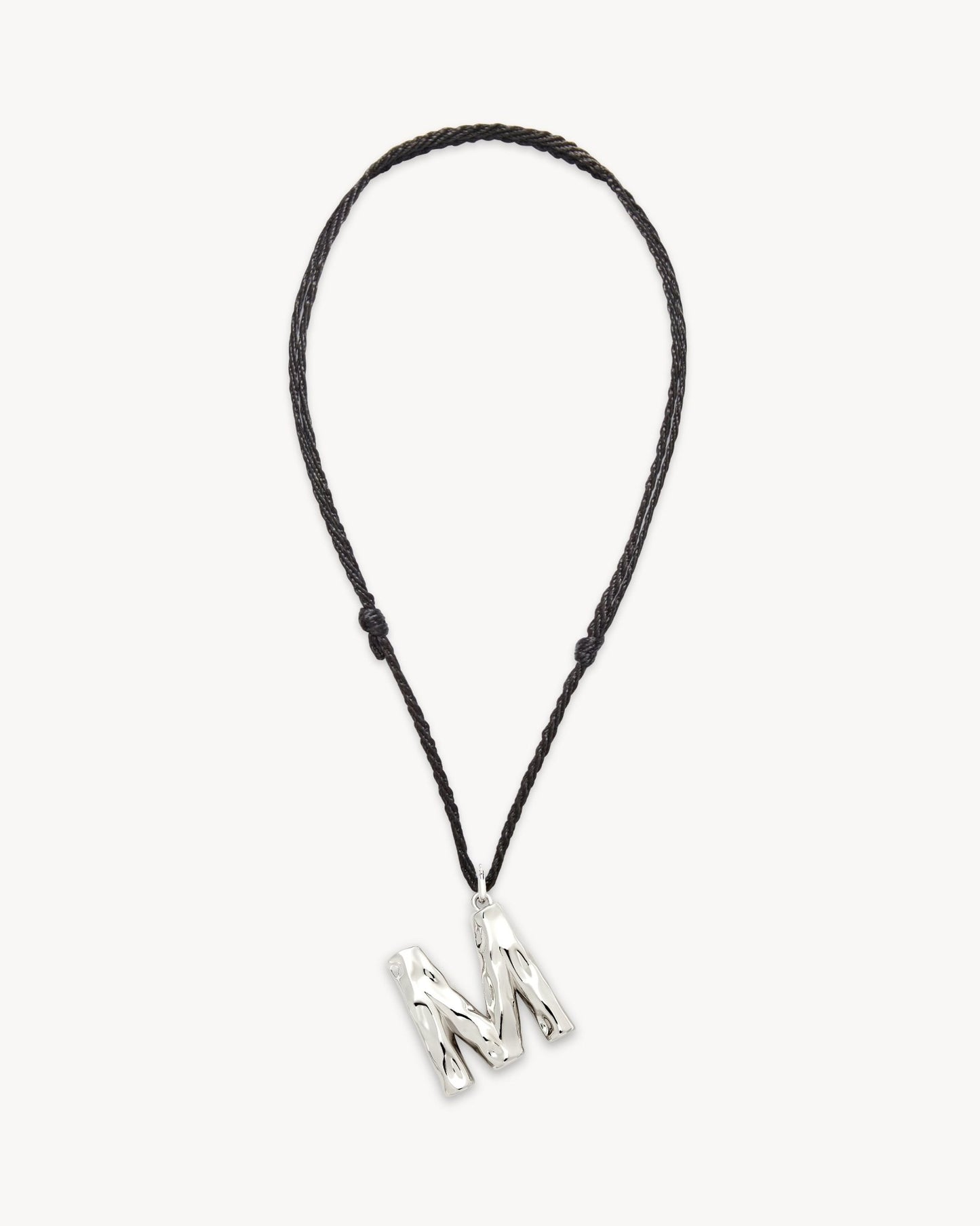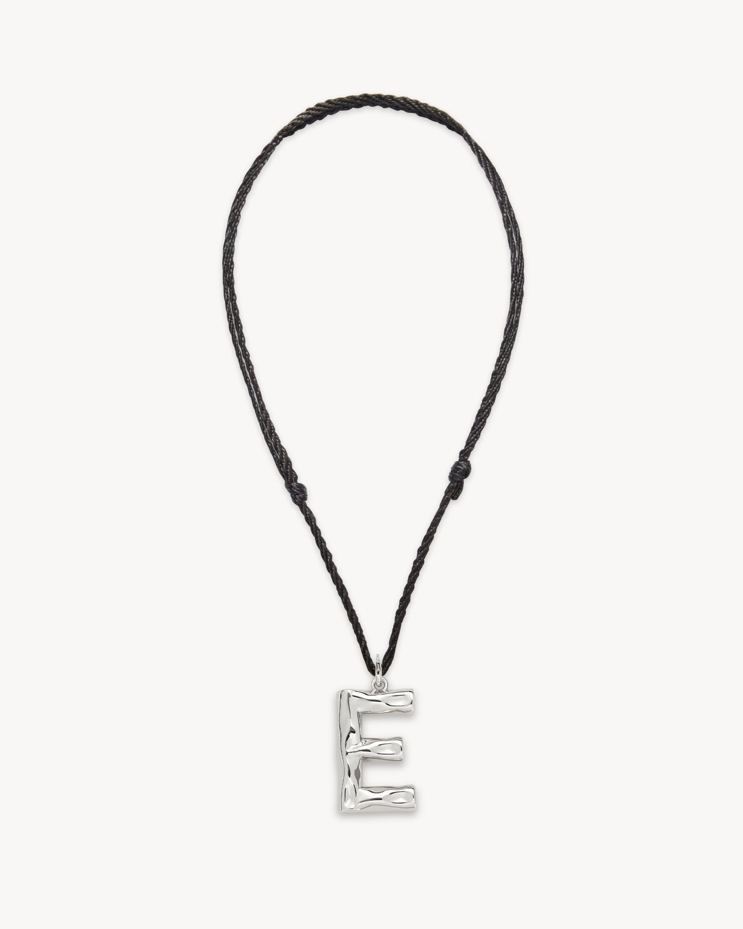 Statement letter charm necklace, handmade from hammered brass with rhodium plating on an adjustable silk cord.