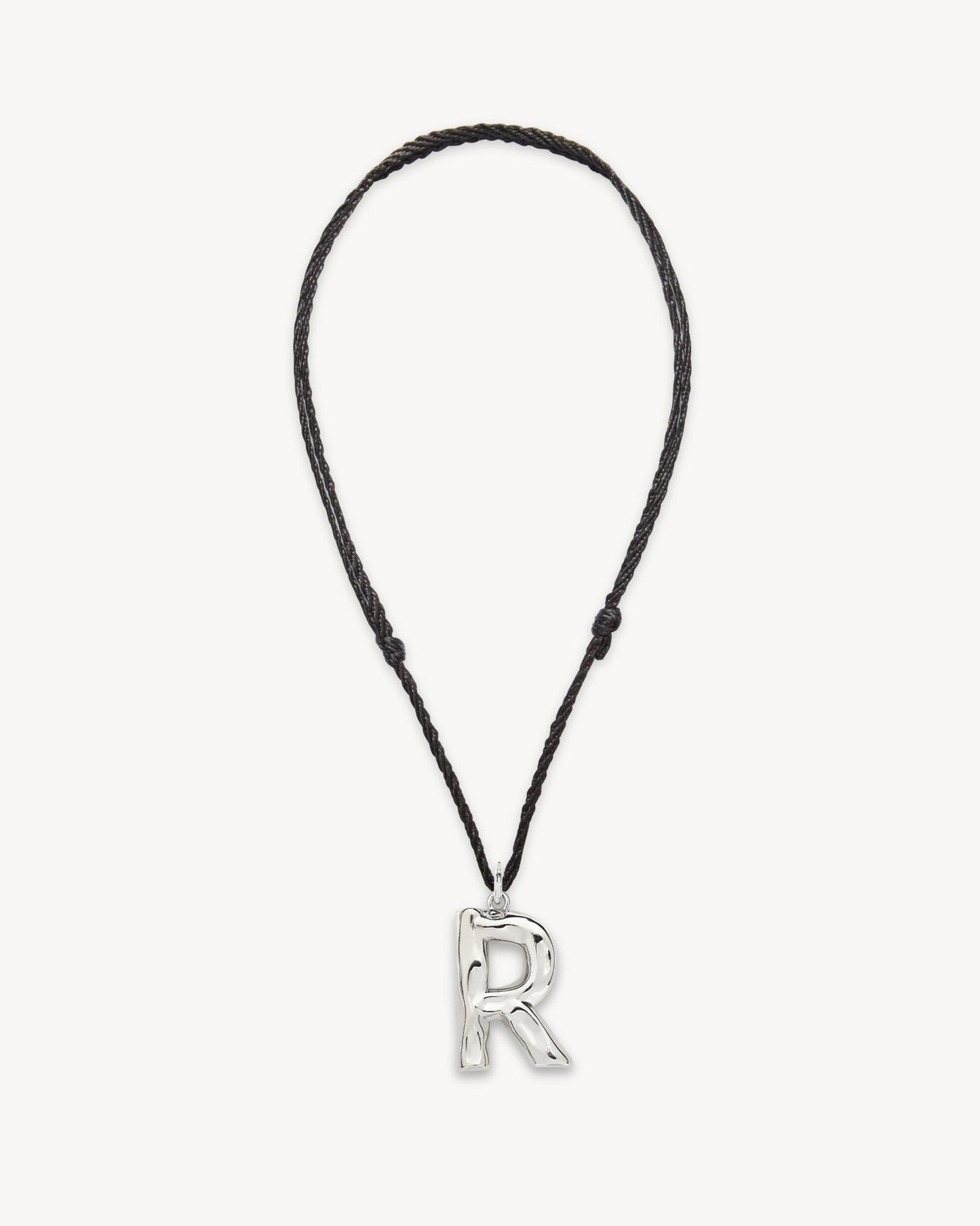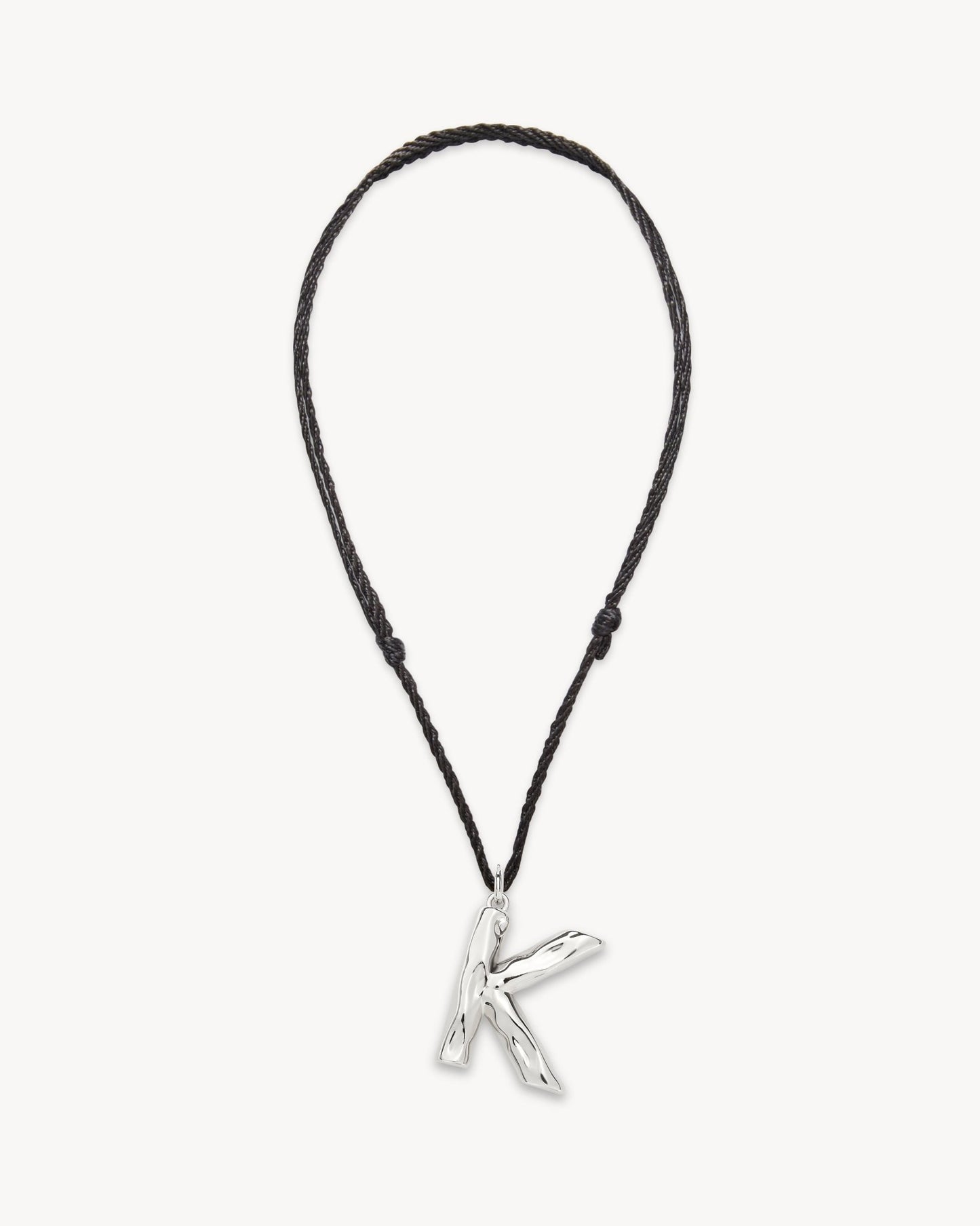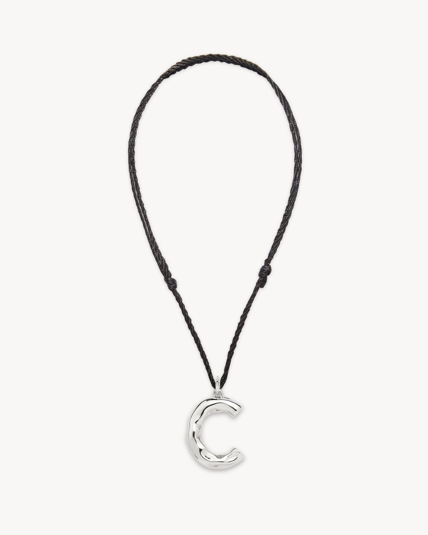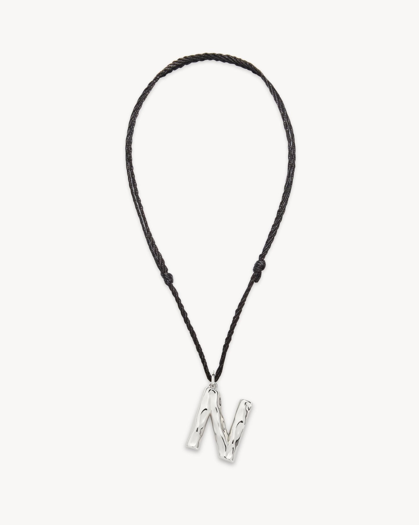 Statement letter charm necklace, handmade from hammered brass with rhodium plating on an adjustable silk cord.