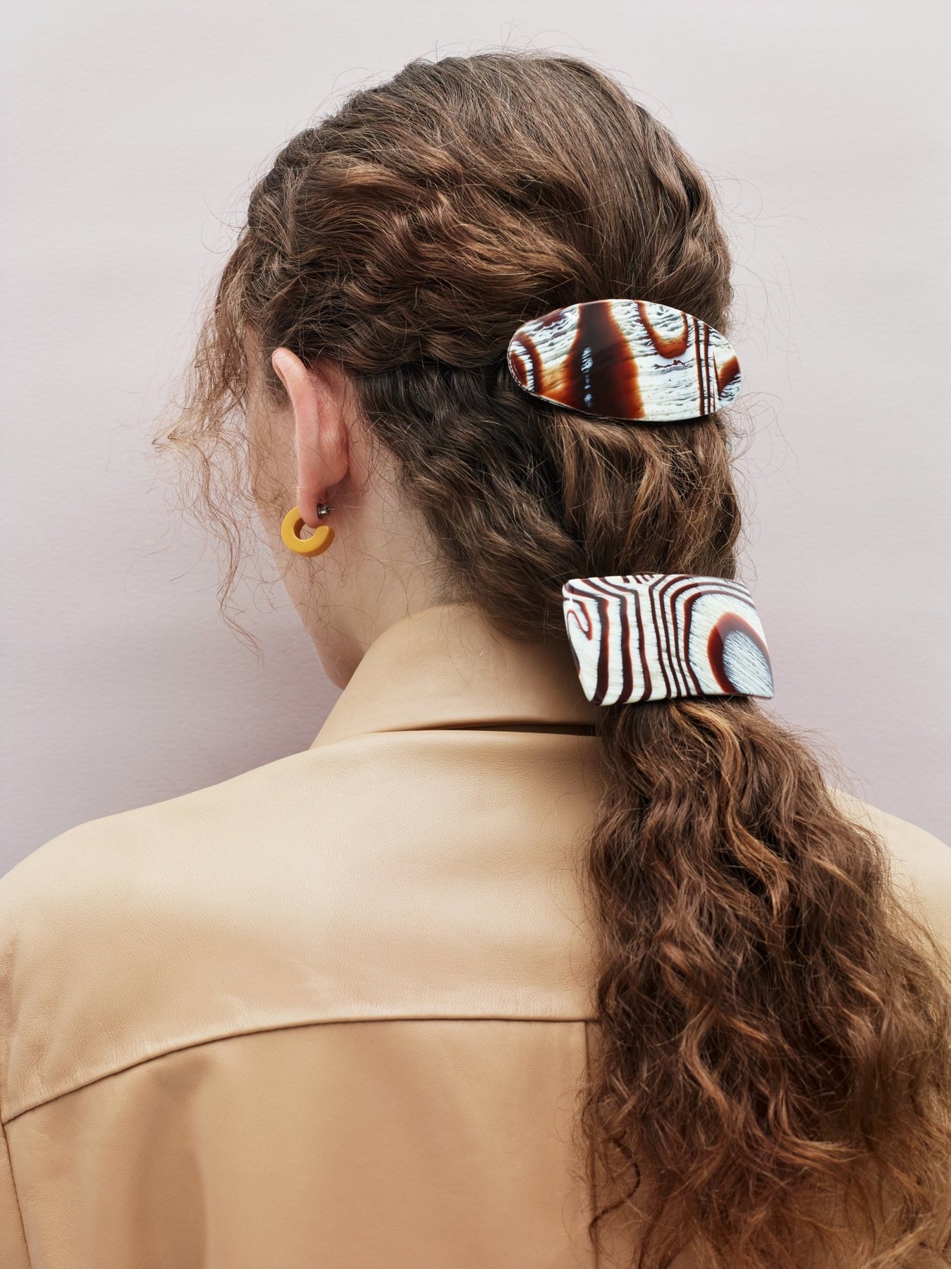 An oversized yet understated barrette, handcrafted from fine Italian acetate. Securely holds medium-to-large volumes of hair.